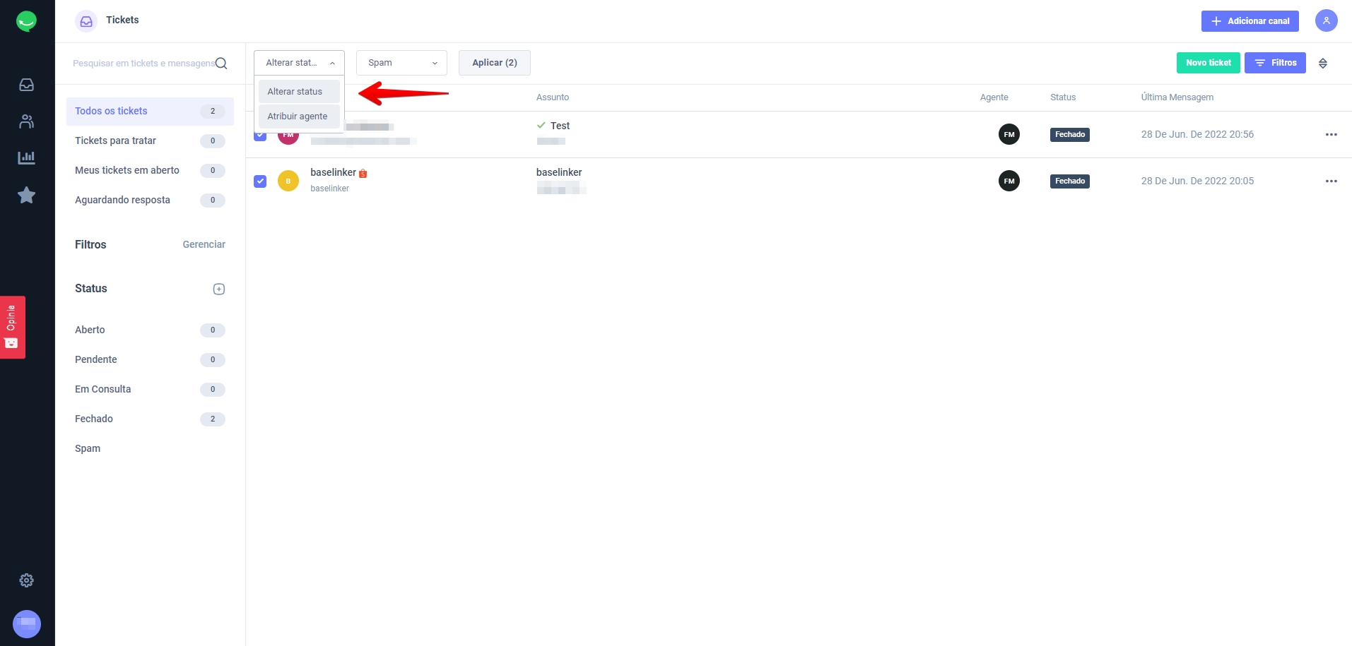 Na Caixa de Entrada, você pode fazer alterações em massa nos tickets. Você pode alterar o status ou fixá-los em um agente dedicado: