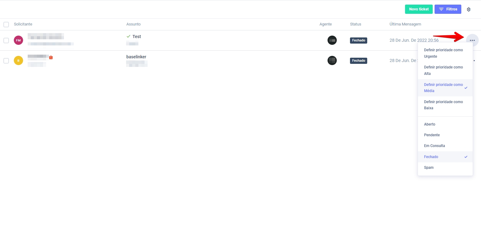 Os tickets mostrarão mensagens com todos os status.