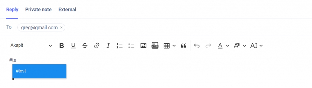 To use a template when replying to a client, enter the sign (#) and a list of defined templates will appear. It is really simple, here is an example: