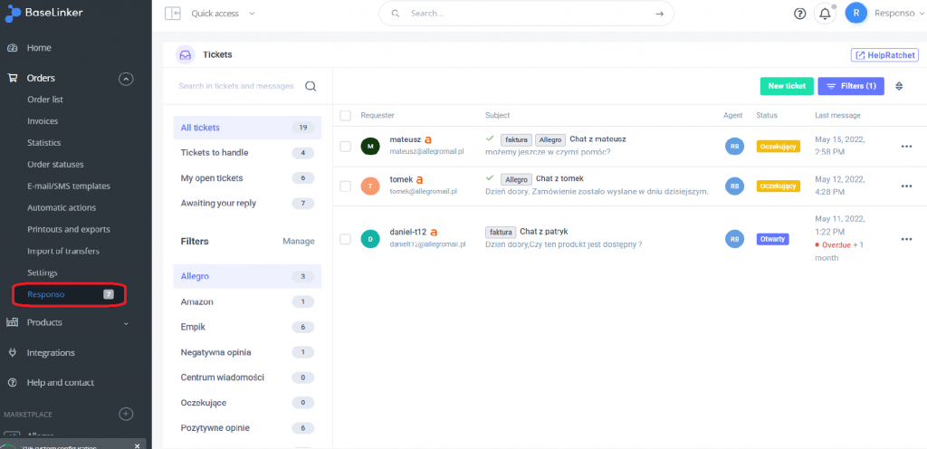 With the integration of Responso, you can extend the functionality of Base. After connecting the two platforms, you will have access to the Responso inbox directly within the Base panel. The Responso plugin will appear in the Orders tab on the left menuβno additional installation is required.