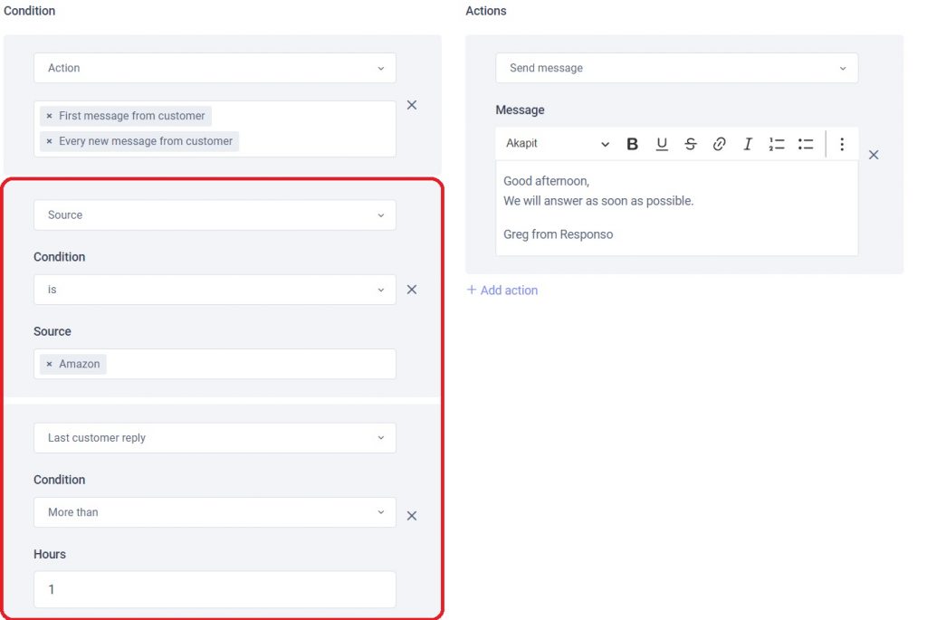 Dans cette section, vous définissez les conditions. Les conditions déterminent dans quelles situations le message automatique sera envoyé.
