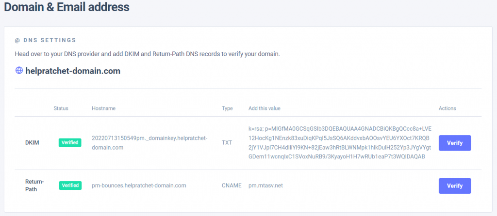 To configure, you need to add your domain. After adding the domain, appropriate DNS records will be generated that should be added. We will be able to confirm that you are its owner and send appropriate headers so that your messages never end up in SPAM.