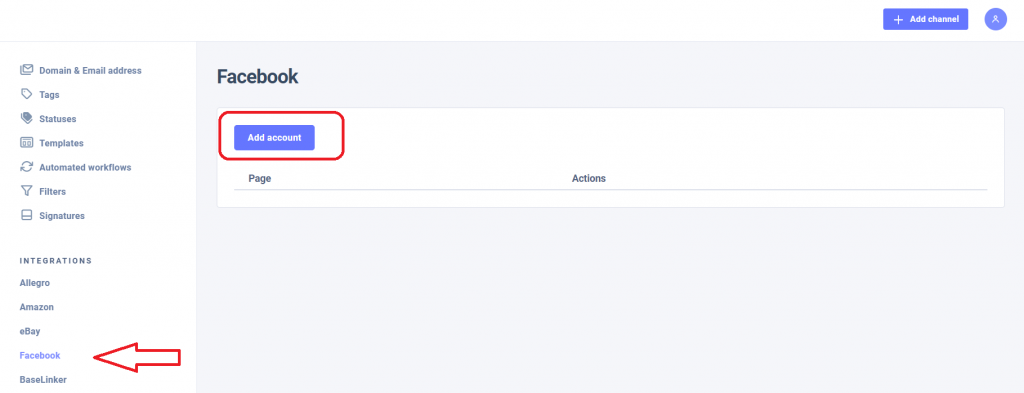 If you want to integrate the Responso system with Facebook Messenger, you must associate your account with our system. To do this, go to Settings> Integrations> Facebook tab, then add your Facebook Messenger accounts. The integration allows you to download messages and reply to them from the Inbox from multiple accounts in Responso.