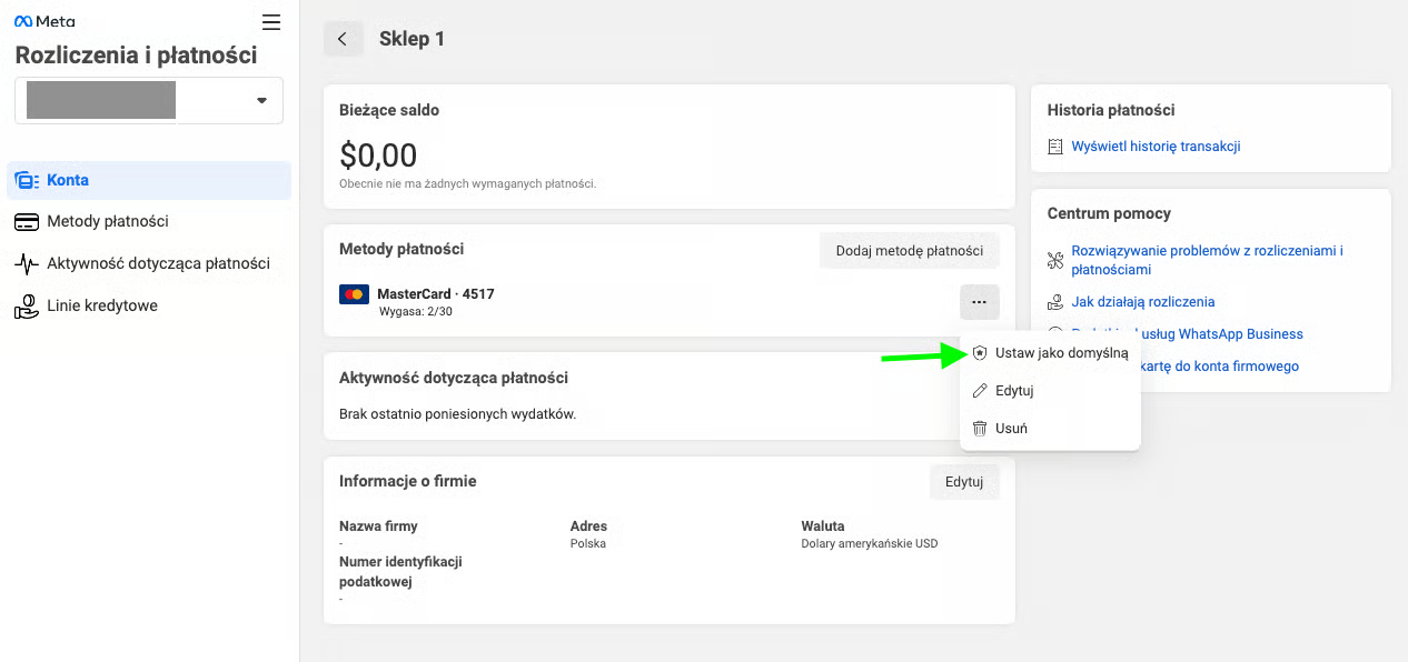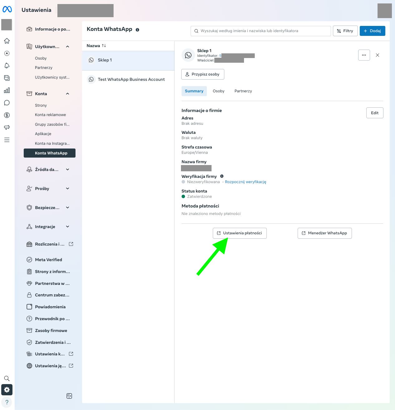 To add a payment method, in your Meta Business account, click "Settings" (gear icon in the lower left corner) > "WhatsApp Accounts" > [Name of the added account] > "Settings" > "Payment Settings".