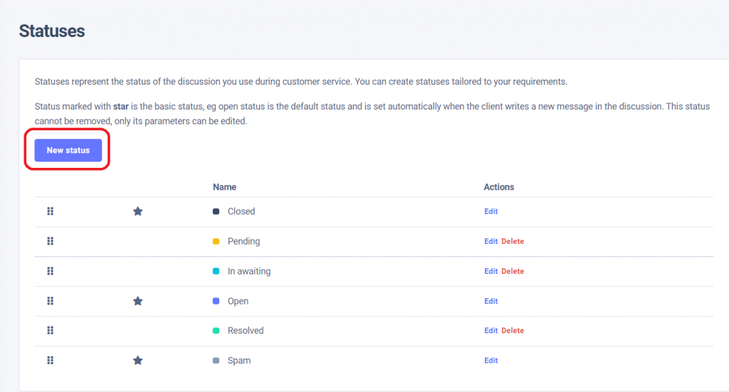 Les statuts indiquent l’état d’une conversation utilisée dans le cadre du service client. Ils vous permettent de suivre le traitement des demandes et peuvent être adaptés à vos besoins.