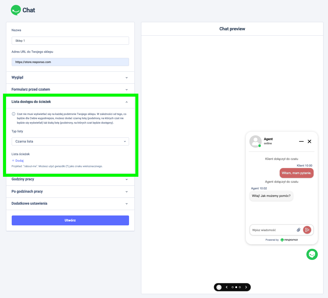 Biała lista oznacza, że czat będzie wyświetlany tylko na wskazanych podstronach.