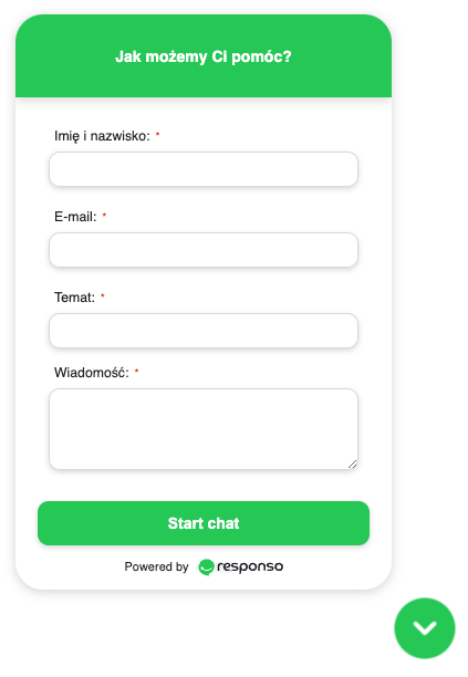 Aby zainicjować czat, klient musi kliknąć ikonę czatu. Wtedy, w zależności od ustawień, zobaczy od razu okno konwersacji lub widok formularza. Kupujący powinien wpisać imię i nazwisko, adres e-mail (posłuży do powiązania ticketu z zamówieniami z BaseLinkera), temat, którego dotyczy wiadomość i treść wiadomości. Aby wysłać wiadomość, należy kliknąć Rozpocznij czat.