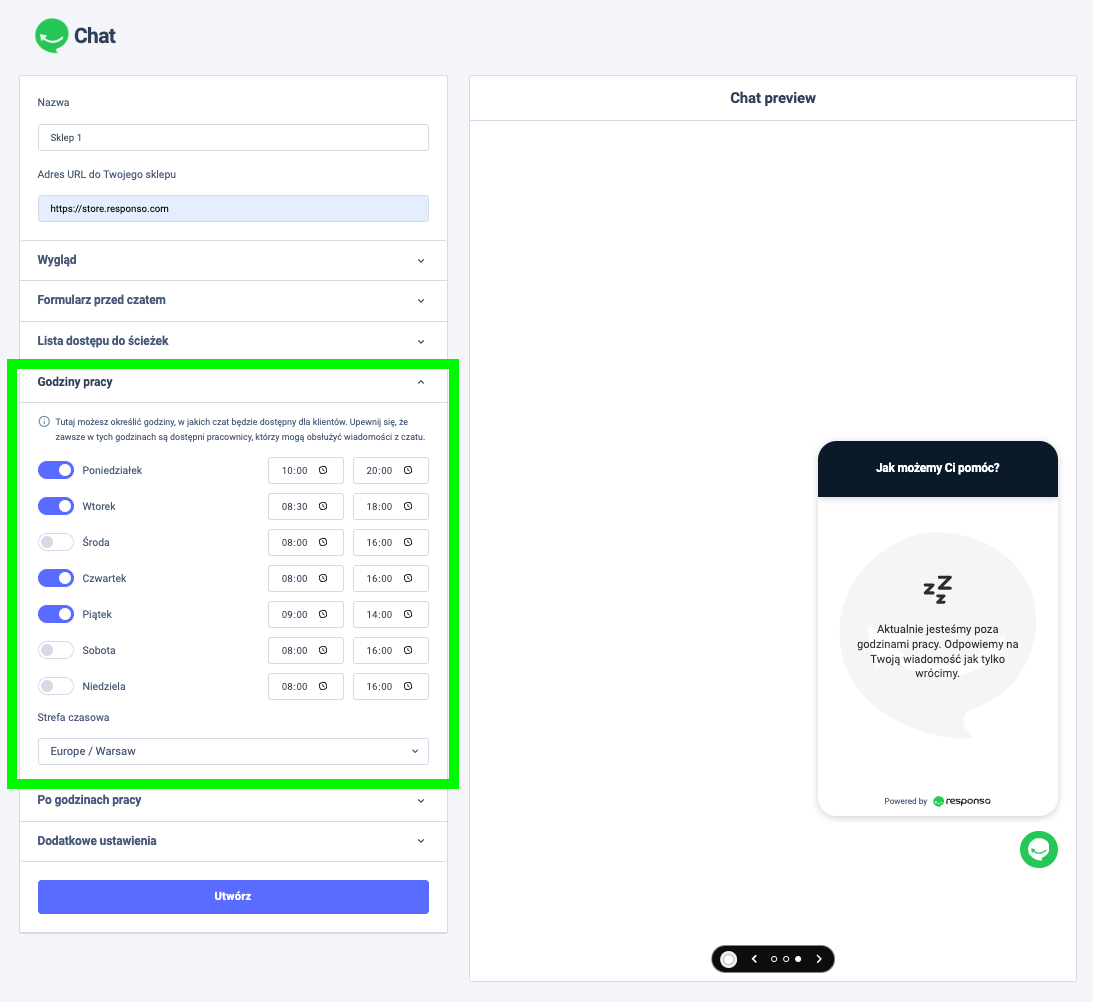 W tej sekcji możesz określić, w jakich godzinach czat ma być dostępny.
