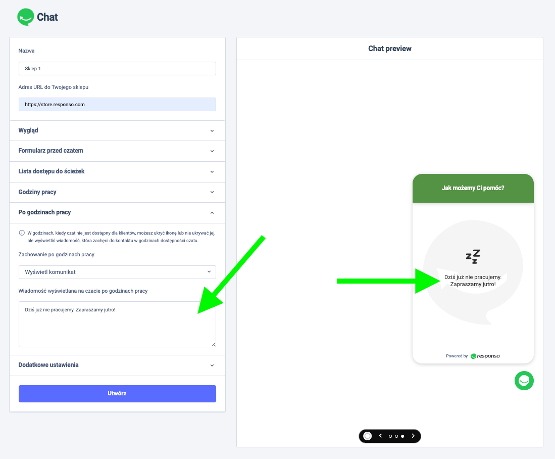 Wiadomość wyświetlana na czacie po godzinach pracy – komunikat wpisany w tym polu jest od razu widoczny na podglądzie.