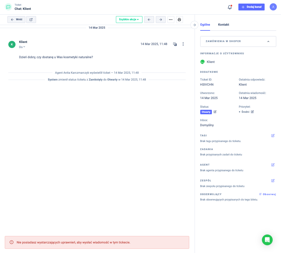 Tickety czatu wyglądają identycznie jak inne, standardowe tickety w Responso. Po prawej stronie w widoku ticketu możesz zobaczyć informacje o tickecie: jego ID, datę utworzenia, datę i nadawcę ostatniej wiadomości w tickecie, status, priorytet, login sprzedawcy (to nazwa chatu, jaka została mu nadana podczas jego tworzenia) oraz inbox, do którego jest przypisany. Możesz z tego miejsca zobaczyć lub dodać tagi, przypisanego agenta, zespół, obserwujących czy powiązane z ticketem zadania.