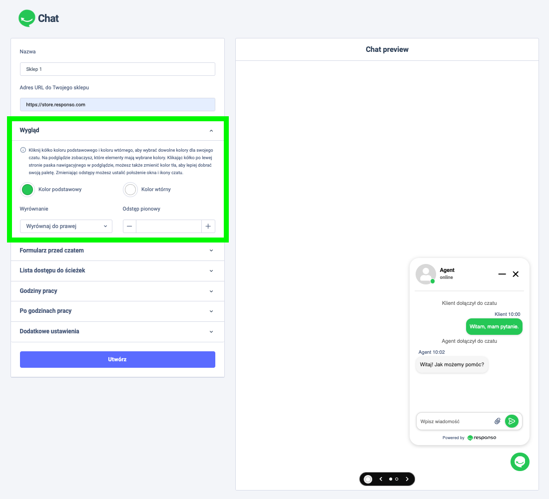 Zobaczysz okno konfiguracji czatu wraz z podglądem. Dzięki temu przed wprowadzeniem zmian możesz zobaczyć, jak będą one wyglądać. Zmiany wprowadzane w sekcjach po lewej stronie będą od razu pojawiały się w podglądzie czatu widocznym po prawej.