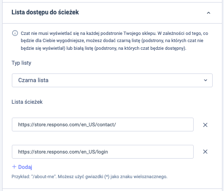Lista ścieżek – kliknij Dodaj i w polu, które się pojawi, wklej ścieżkę (adres podstrony), na na których czat ma być wyświetlany (w przypadku typu: biała lista) lub na których ma być niewidoczny (w przypadku typu: czarna lista).