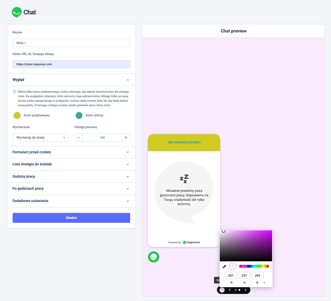 Kolor wtórny – to kolor innych elementów, takich jak tekst wiadomości klienta, wiadomości powitalnej. Możesz wybrać dowolny kolor używając suwaka, próbnika (aby pobrać kolor z dowolnego miejsca na ekranie) lub wpisać kod RGB.