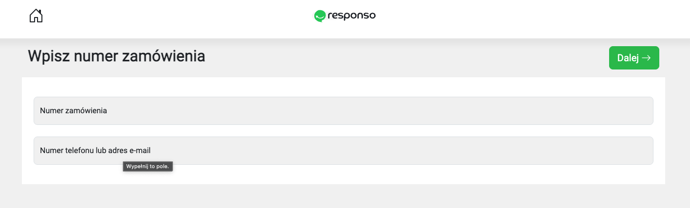 2. Po kliknięciu przycisku *Start* klient musi podać numer zamówienia oraz numer telefonu lub adres e-mail powiązany z tym zamówieniem. Jeśli wpisze inny numer lub mail niż ten podany przy zamówieniu, system nie będzie w stanie wyszukać zamówienia i klient nie przejdzie do kolejnego ekranu formularza. Po wpisaniu właściwych danych należy kliknąć *Dalej.*<br>
