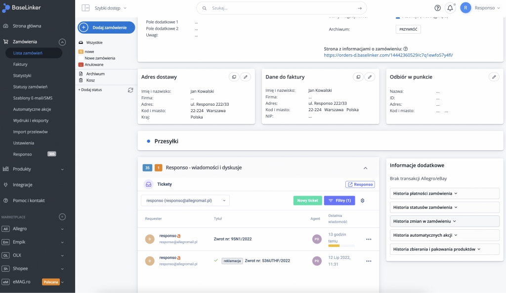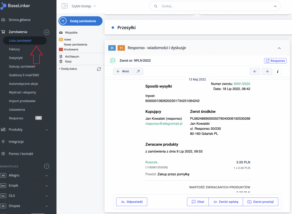 Informację na temat zwrotów w BaseLinker znajdziesz tutaj.