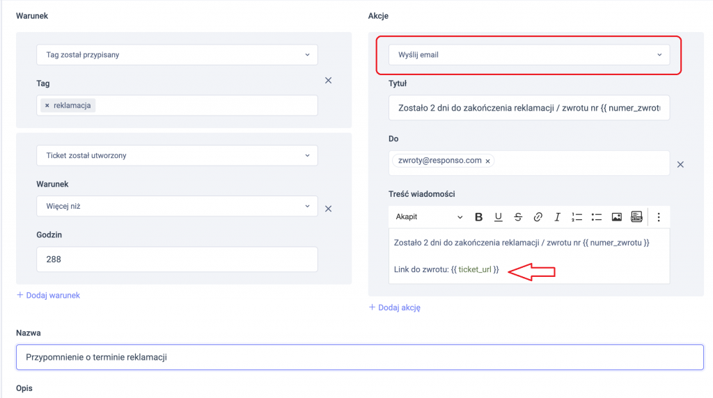 Poniżej schemat przedstawia sytuację, w której otagowany przez Ciebie ticket np. tagiem „reklamacja” uruchomi akcję wysyłki email z przypomnieniem po 12 dniach od daty otrzymania na konkretny adres email. W treści wiadomości wprowadź {{ ticket_url }} aby system automatycznie dodał link w przypomnieniu z konkretnym ticketem oraz {{ numer_zwrotu }} aby system dodał numer zwrotu: