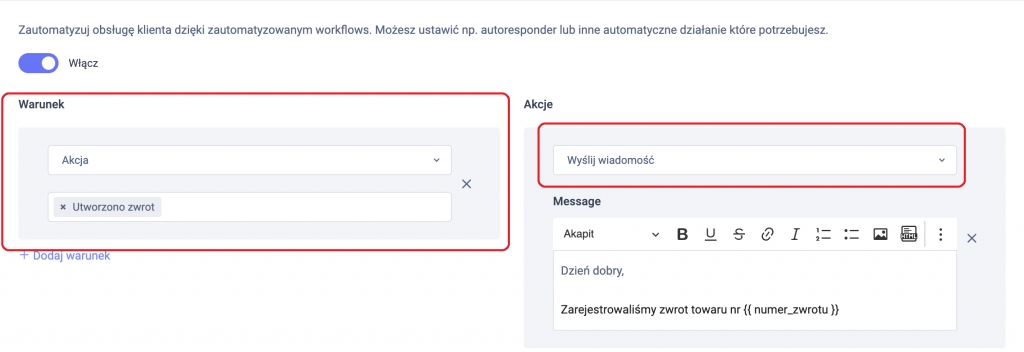 Dodatkowo, możesz ustawić akcję informującą Twojego klienta o zarejestrowaniu zwrotu lub reklamacji, w treści wiadomości wprowadź {{ numer_zwrotu }} aby system automatycznie dodał numer zwrotu w notyfikacji do klienta: