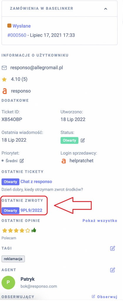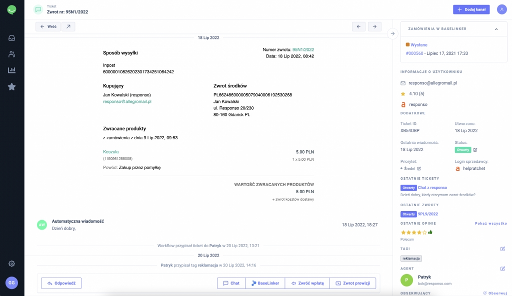 Jeśli korzystasz z integracji BaseLinker w Responso, to w szybki sposób możesz przejść z ticketu Responso do zwrotu w BaseLinkerze za pomocą przycisku:
