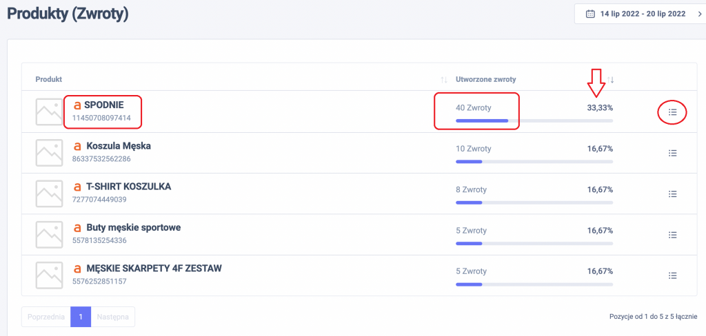 ilość utworzonych zwrotów w danym okresie dla poszczególnego produktu