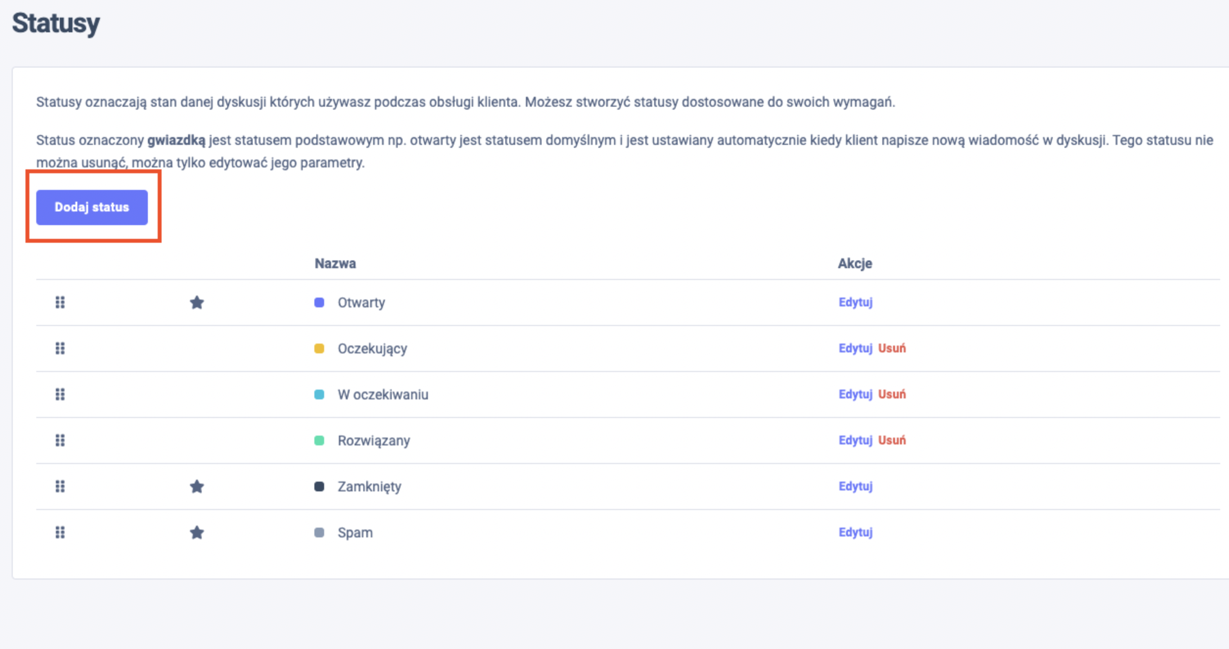 Status oznaczony **gwiazdką** jest statusem podstawowym np. otwarty jest statusem domyślnym i jest ustawiany automatycznie kiedy klient napisze nową wiadomość w dyskusji. Tego statusu nie można usunąć, można tylko edytować jego parametry.