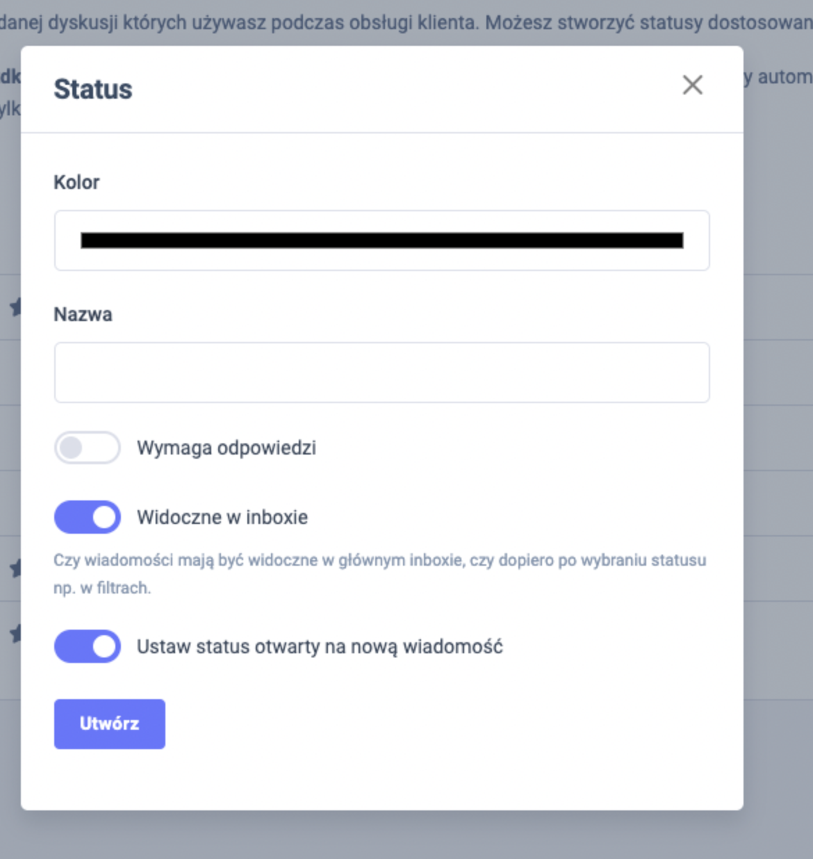 * Widoczne w inbox – Czy wiadomości mają być widoczne w głównym inboxie, czy dopiero po wybraniu statusu np. w filtrach