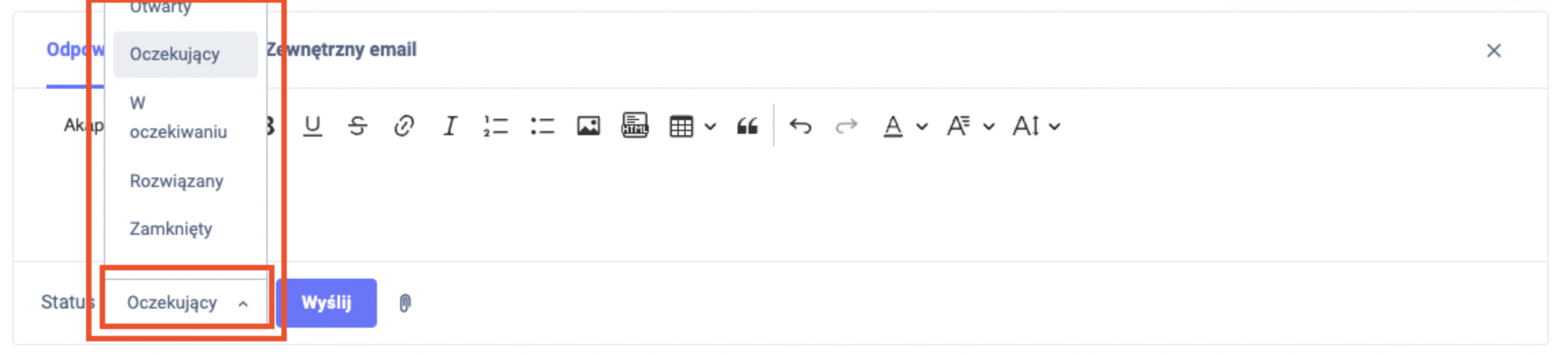 W systemie Responso najważniejszym statusem jest status otwarty. Jest to status, który oznacza, że ostatnia wiadomość jest od klienta. Jeżeli podczas odpisywania zmienimy status na jakikolwiek inny, zawsze zmieni się on na otwarty jeżeli otrzymamy odpowiedz&#x20;