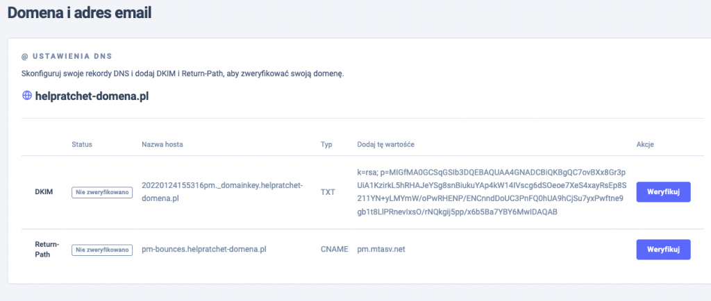 Aby dokonać konfiguracji należy dodać swoją domenę. Po dodaniu domeny zostaną wygenerowane odpowiednie rekordu DNS które należy dodać. Dzięki temu będziemy mogli potwierdzić iż jesteś jej właścicielem oraz wysyłać odpowiednie nagłówki aby Twoje wiadomości nie trafiły nigdy do SPAM.