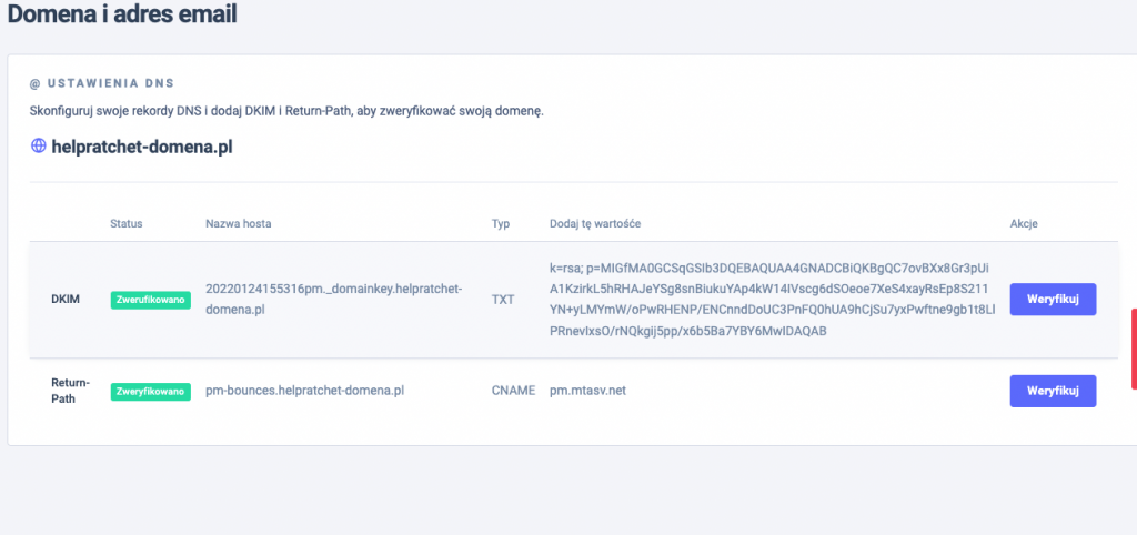 Po dodaniu powyższych rekordów klikamy w weryfikuj. Tutaj dzieje się to automatycznie, więc jeżeli od razu weryfikacja nie przebiegła pomyślnie, wróć tutaj za chwilę.