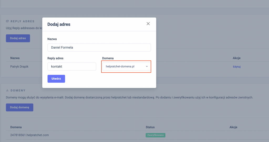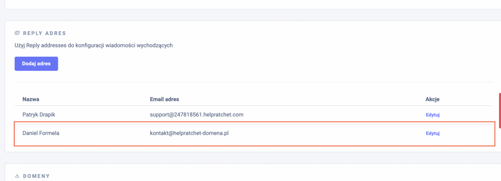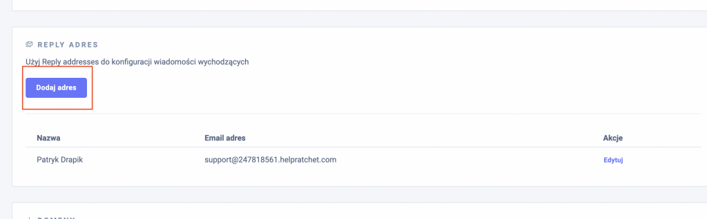 Aby dodać nowy adres odpowiedzi należy przejść do bloku “Reply Adres” następnie kliknąć przycisk “Dodaj adres”