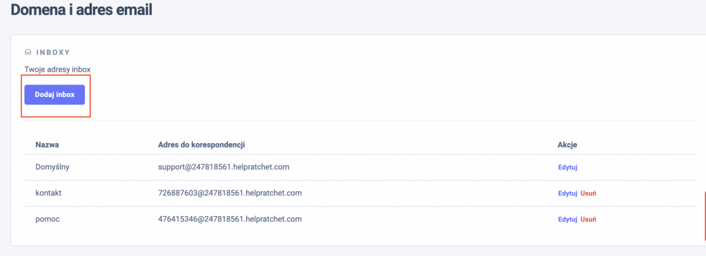 Aby dodać nowy Adres do korespondencji należy w oknie konfiguracji kliknąć przycisk “Dodaj inbox”