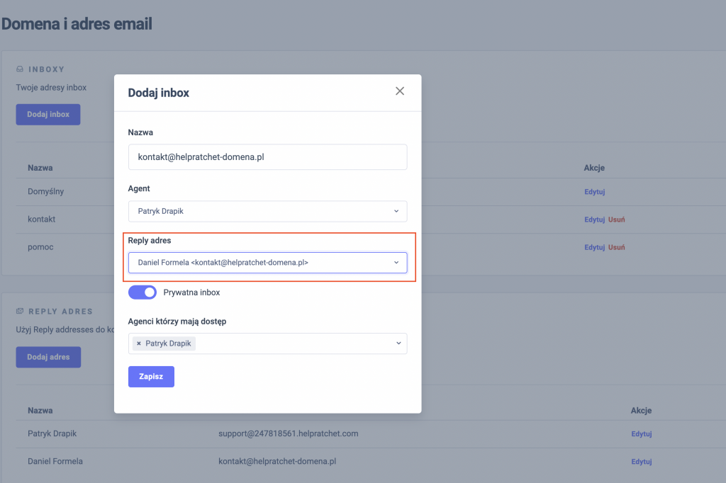Prywatny inbox – inbox może być prywatny i będą mieli dostęp do niego tylko agenci którzy będą do niego przypisani oraz administratorzy.