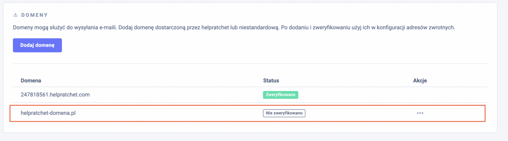 Po poprawnej weryfikacji domena zostanie zapisana w systemie.