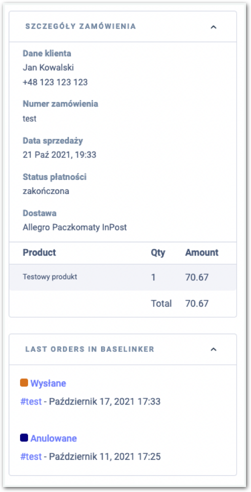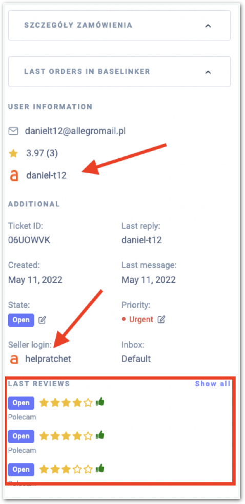 Oraz w widoku szczegółów wiadomości w przypadku dyskusji mamy dodatkowo informacje o zamówieniu i jego szczegółach:<br>