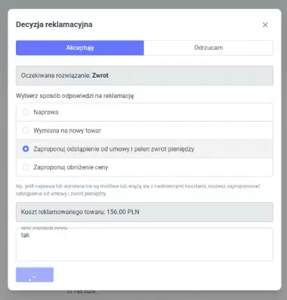 **Krok 2 – Decyzja reklamacyjna.** Możesz zdecydować przy pomocy formularza, czy uznajesz reklamację, a jeśli tak, to jakie rozwiązanie proponujesz kupującemu. Jeśli odrzucisz reklamację, możesz potem zmienić zdanie i uznać ją. Jeśli ją uznasz, ta decyzja jest ostateczna. Ten krok możesz wykonać z poziomu Responso, klikając przycisk *Decyzja reklamacyjna*.