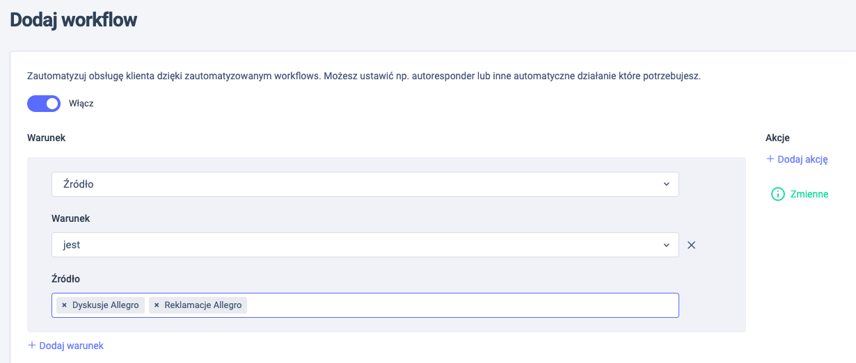 Jeśli przed 28.10.2025 na Twoim koncie były utworzone automatyzacje dla źródła Dyskusje, to w warunkach tych automatyzacji zostało automatycznie dodane źródło Reklamacje.
