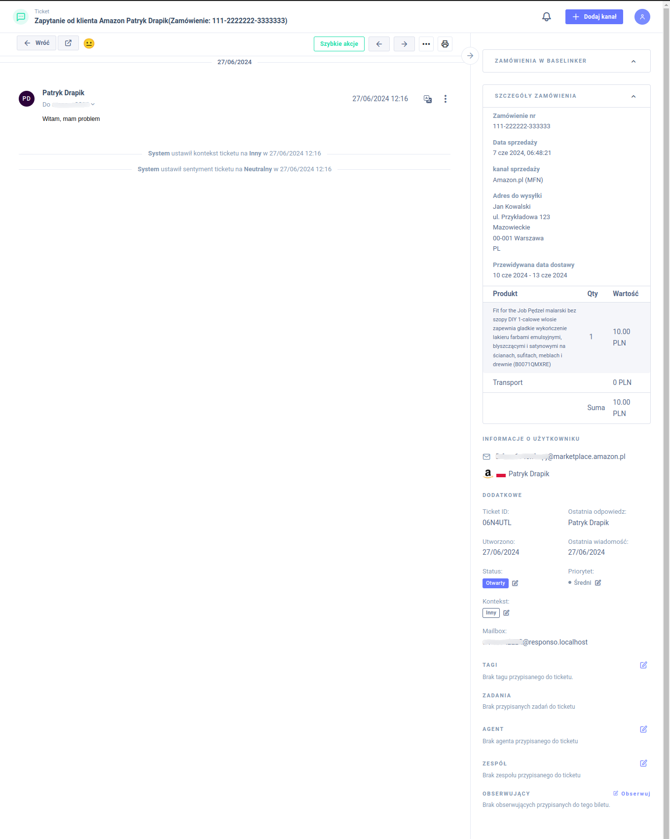 Więcej szczegółowych informacji na temat danej wiadomości znaleźć można w widoku ticketu, po prawej stronie (po otwarciu danej wiadomości). Są to między innymi: nazwa kupującego, numer zamówienia, nazwa produktu, data sprzedaży, kanał sprzedaży, adres do wysyłki czy przewidywana data dostawy.