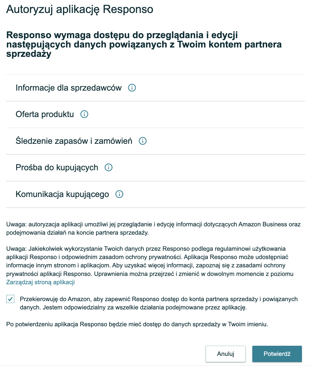 5. Zapoznaj się z informacjami na temat autoryzacji, zaznacz checkbox, a następnie kliknij ***Potwierdź**.* Zostaniesz przekierowany z powrotem do Responso.\ <br>