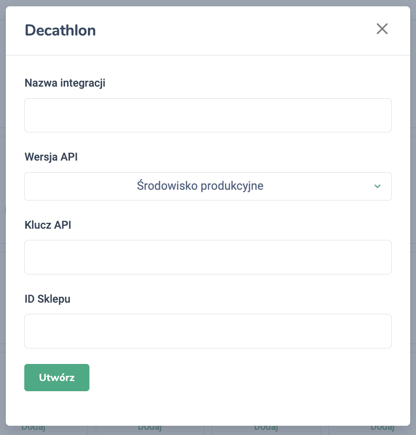 6. W wyświetlonym oknie wklej skopiowany wcześniej klucz API. Uzupełnij także nazwę integracji i dodaj ID sklepu, który integrujesz z Responso (podanie ID jest obowiązkowe, nawet jeśli posiadasz jeden sklep na B\&Q). Po wprowadzeniu danych kliknij *Utwórz*.