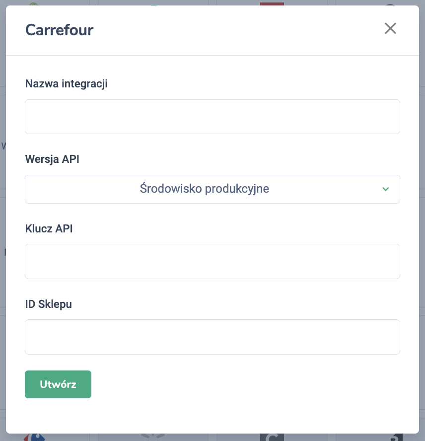 6. W wyświetlonym oknie wklej skopiowany wcześniej klucz API. Uzupełnij także nazwę integracji i dodaj ID sklepu, który integrujesz z Responso (podanie ID jest obowiązkowe, nawet jeśli posiadasz jeden sklep na Carrefour). Po wprowadzeniu danych kliknij *Utwórz*.