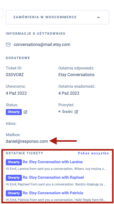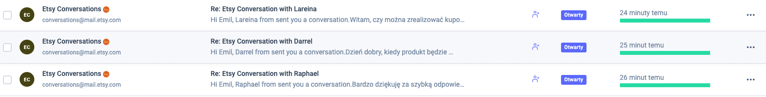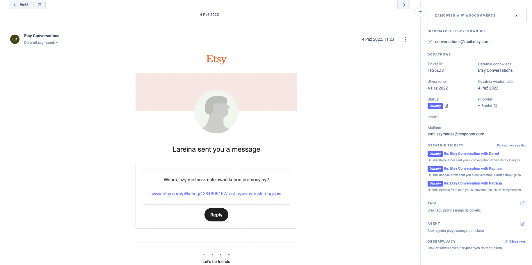 **Etsy nie umożliwia pobierania wiadomości bezpośrednio, jeżeli tylko taka integracja będzie możliwa od razu dodamy ją w Responso.**