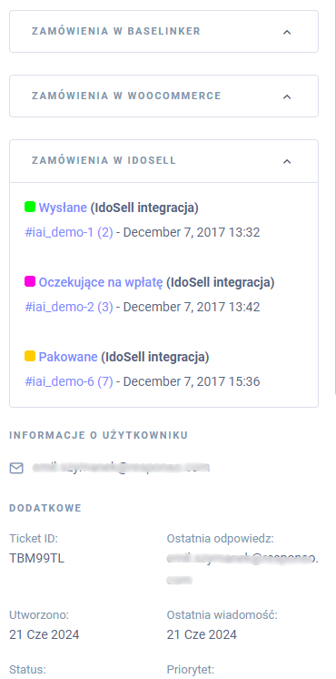 Dzięki dodaniu tej integracji z Idosell będą pobierane dane o zamówieniach, a Responso połączy je z adresami e-mail Twoich klientów. W ten sposób z poziomu ticketu będziesz mieć dostęp do informacji np. o statusie zamówienia.