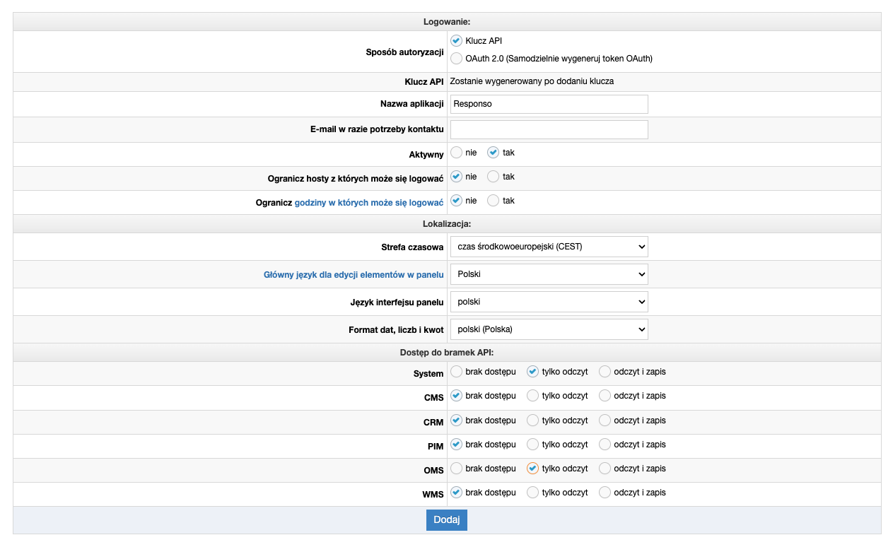 4. W ustawieniach klucza wpisz nazwę aplikacji (Responso). Możesz też podać dowolny adres e-mail do kontaktu. Do prawidłowego działania Responso potrzebuje uprawnień na poziomie "tylko odczyt" do bramek API: System i OMS. <br>