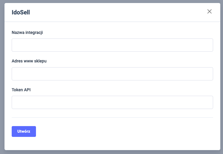 8. Wpisz nazwę integracji, a w polu *Token API* wklej skopiowany z Idosell klucz API. W polu *Adres www sklepu* wklej adres sklepu Idosell (uwaga: należy wkleić pełny adres z https\://).\ <br>