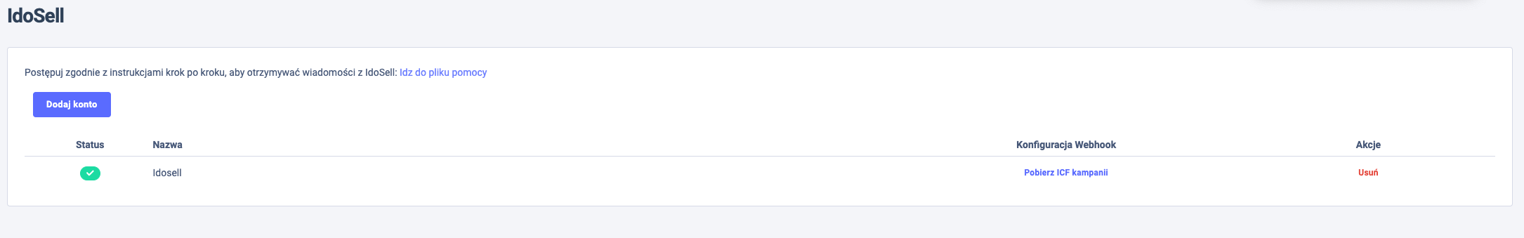 12. Przy nazwie dodanej integracji **w panelu Responso** kliknij ***Pobierz ICF kampanii***. Na Twój dysk zostanie wtedy pobrany plik konfiguracyjny, który wystarczy dodać do panelu Idosell.\ <br>