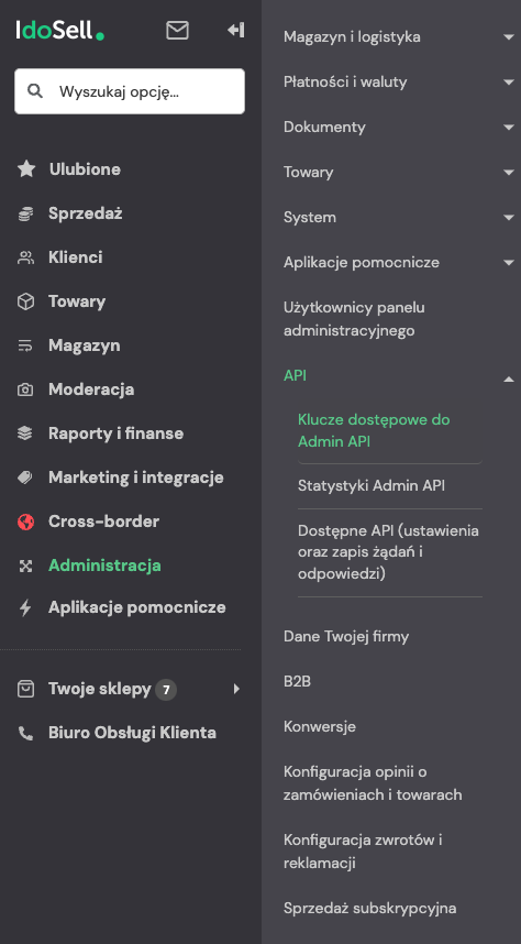 2. Z menu po lewej stronie wybierz ***Administracja*****&#x20;->&#x20;*****API ->*** ***Klucze dostępowe do Admin API***.<br>