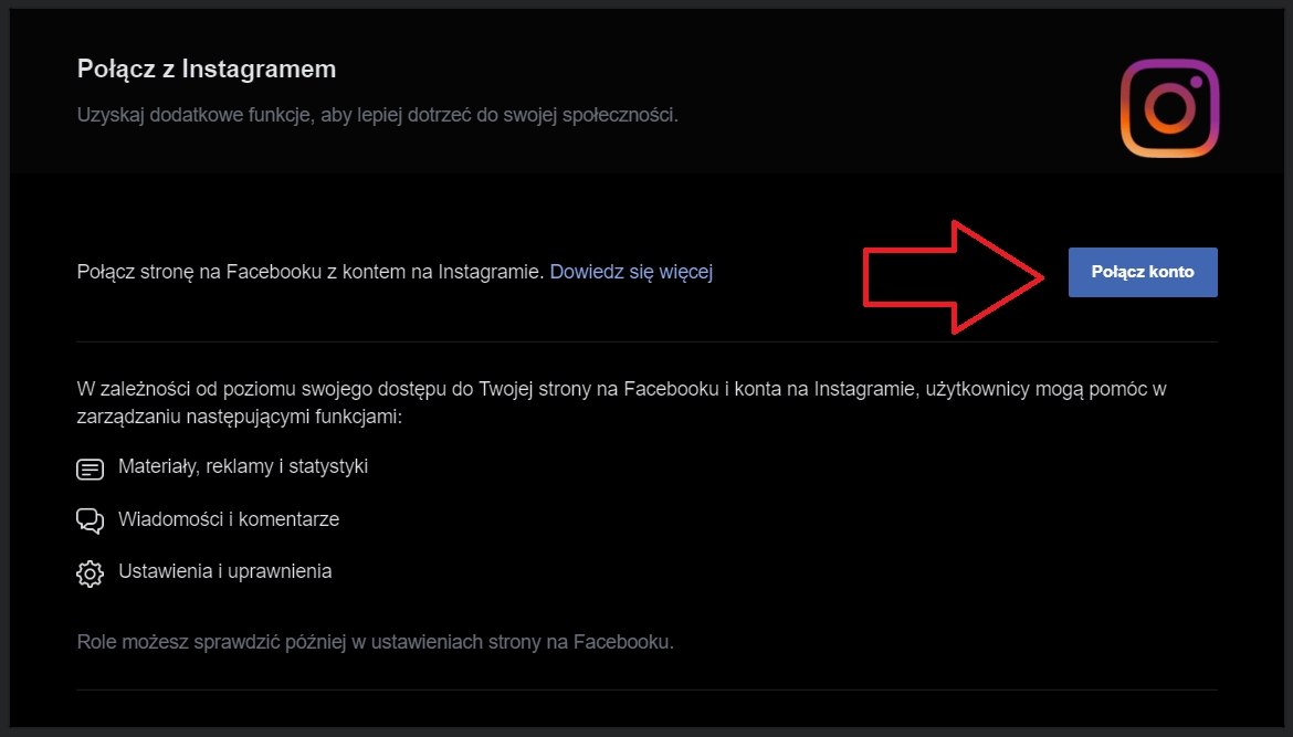 Powiąż swoje konto na Instagramie z fanpagem na Facebooku.