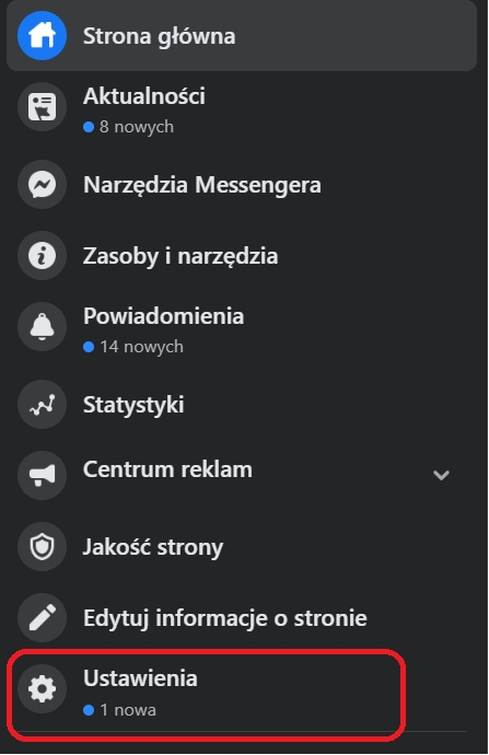 Zaloguje się do Facebooka oraz przejdź do fanpagu, z którym chcesz połączyć konto na Instagramie. Wejdź w ustawienia: