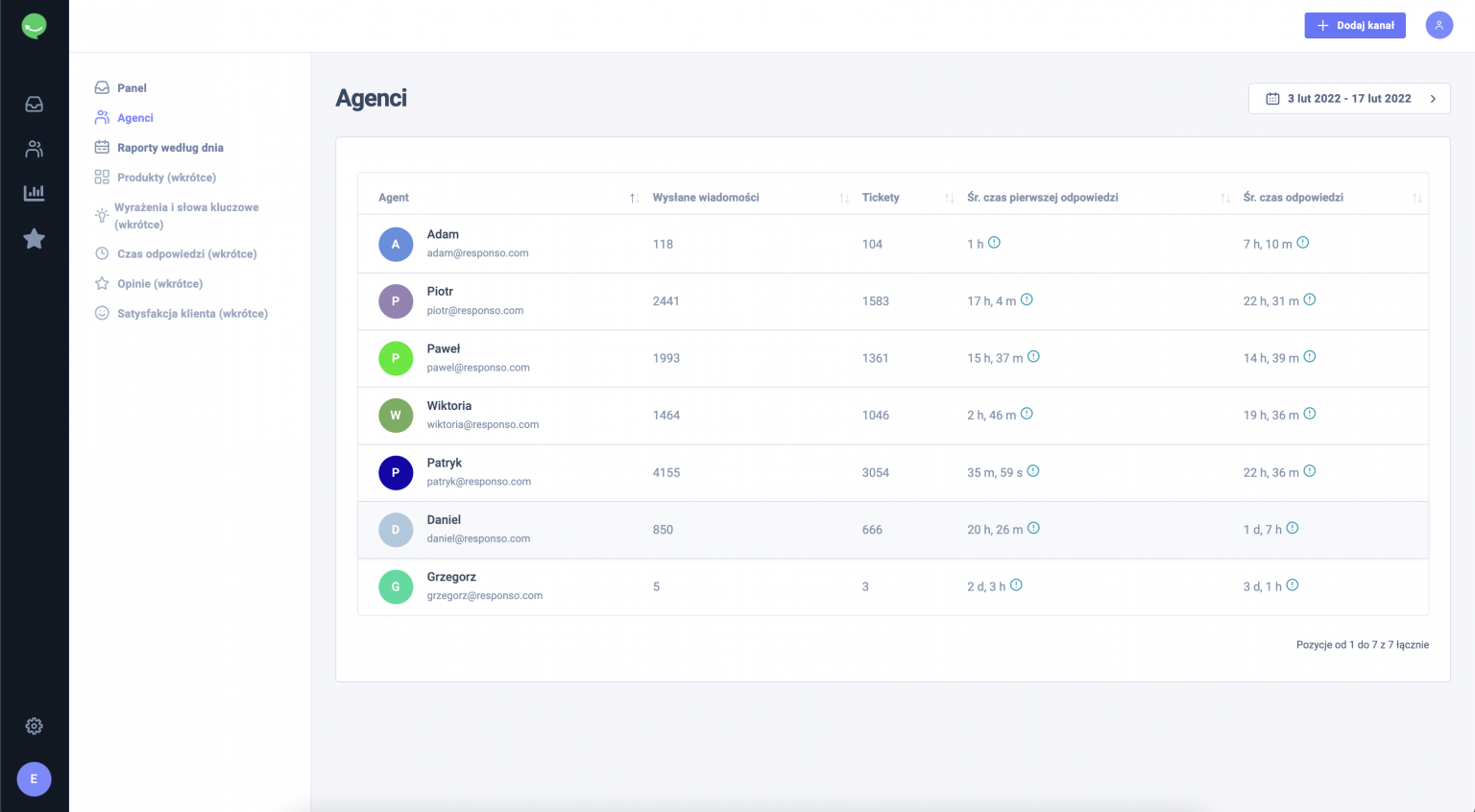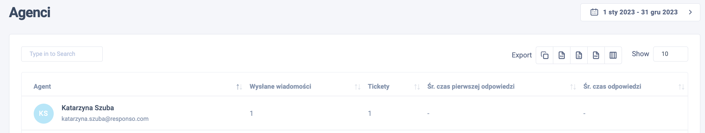 Wybierając z menu po lewej zakładkę *Agenci*, możesz zobaczyć raporty dotyczące efektywności swoich pracowników. Sprawdzisz tutaj liczbę wiadomości wysłanych przez danego agenta, liczbę przypisanych do niego ticketów, a także średnie czasy pierwszej odpowiedzi i odpowiedzi w ujęciu ogólnym. Kolejność na liście możesz sortować według wybranego parametru - aby to zrobić, kliknij ikonę strzałek przy odpowiedniej pozycji.