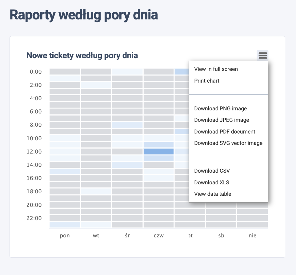 Raport pozwala sprawdzić liczbę ticketów z wybranego okresu w podziale na konteksty.