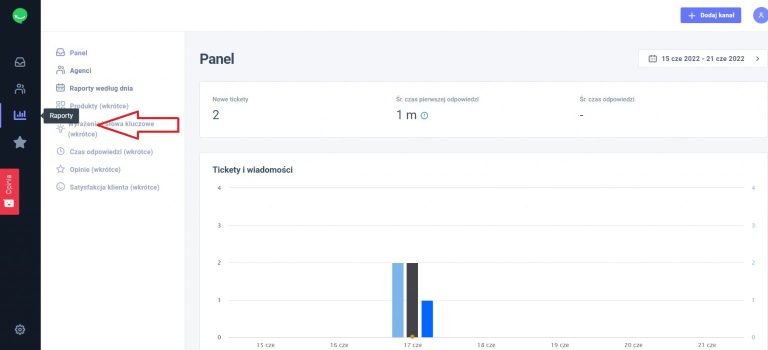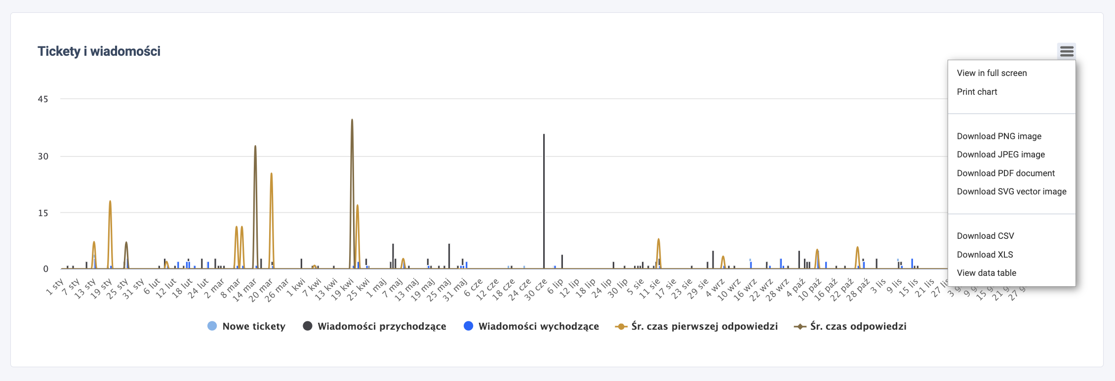 * wykres tickety i wiadomości, gdzie oprócz powyższych liczb możesz zobaczy także dane na temat wiadomości wychodzących i przychodzących w danym okresie;